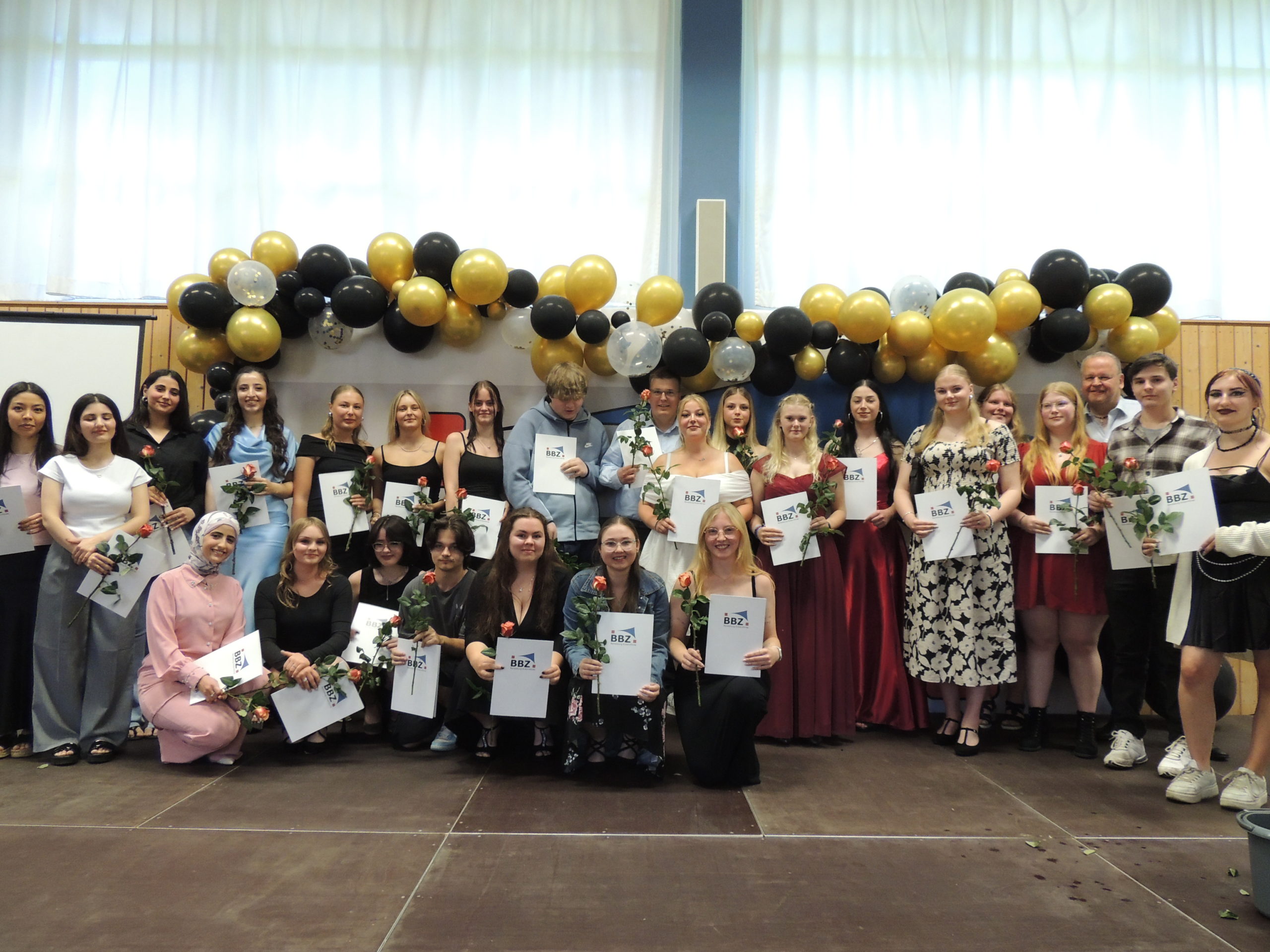 So viele glückliche Gesichter am BBZ. Die Prüfungen sind bestanden, die Schulzeit ist beendet. Heute gibt es endlich die langersehnten Abschlusszeugnisse. Um die Arbeit und den Einsatz der Schülerinnen und Schüler auch zu würdigen, findet die Übergabe der Zeugnisse in einem feierlichen Rahmen statt. Dazu hat die Klasse SPA.22 die Sporthalle geschmückt und die BFG.23 und SPA.23 servieren Getränke.